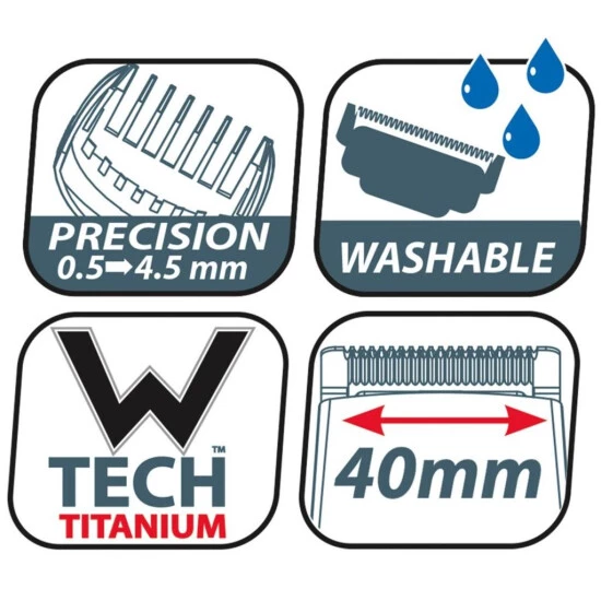 W-Tech Haarschneidemaschinen verfügen über selbstschmierende und bewegliche Schneidklingen für optimale Ergebnisse. Es ist einfach mit einem integrierten Einstellrad einzustellen und mit W-Tech-Schneidklingen ausgestattet, die ein um 25% schnelleres Schneiden ermöglichen. Der Haarschneider hat 40 mm Klingen und 37 verschiedene Schnittlängen, die zu Ihnen passen. Zwei Kammführungen sind enthalten.