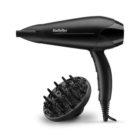Babyliss Haartrockner Power DRY D563DE – Eigenschaften: Gleichstrommotor / Luftstrom 91 km/h / Abnehmbarer hinterer Filter / Leichtgewicht / Keramiktechnologie – Anzahl der Temperaturen: 2 Temperaturen – Bürsten und Zubehör enthalten: 1 Konzentrator 13 x 76 mm, 1 Diffusor 15 cm breit