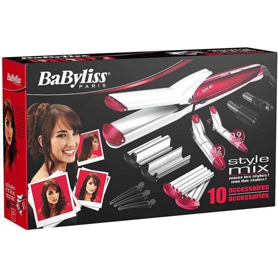 Der Alleskönner Style Mix von BaByliss, ein Styling-Tool für unzählige Looks, zaubert im Handumdrehen unzählige Looks. Dieses smarte Tool wird mit acht verschiedenen Aufsätzen geliefert ? so lassen sich definierte Locken genauso einfach kreieren wie Naturwellen, Kreppfrisuren oder ultraglatte Frisuren. Clips zum Trennen der Haare und Haarnadeln sind ebenfalls enthalten, sodass diese Style-Kombination alles hat, was Sie brauchen, um jeden Tag einen neuen persönlichen Look zu kreieren. Weitere Informationen zu diesem Produkt Austauschbares Zubehör Keramikbeschichtete Platten 19-mm- und 32-mm-Lockenwickler Deep Wave-Platte und Kreppkopf Bürste und Gleitschraube Sicherheitssystem für Plattenaustausch Ein-/Aus-Taste 1,8 m Drehkabel 3 abnehmbare Clips und 12 Haarnadeln